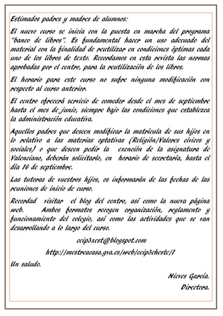 Este documento presenta información sobre el inicio del nuevo curso escolar en el Colegio de Educación Infantil y Primaria No 3 de Cheste. Se proporciona el horario escolar, fechas importantes como vacaciones y días festivos, normas sobre el uso y mantenimiento de los libros de texto, y detalles sobre el servicio de comedor. También se incluye información sobre las reuniones de tutoría y las actividades realizadas por el AMPA durante el curso pasado.