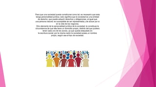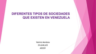 Este documento describe los diferentes tipos de sociedades que existen en Venezuela, incluyendo sociedades mercantiles, civiles, cooperativas y de producción social. Explica que para constituir una sociedad se requiere personalidad jurídica y un elemento patrimonial. Luego resume los requisitos clave de cada tipo de sociedad.