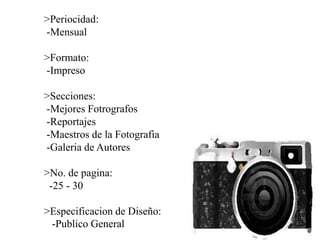 La revista de fotografía es mensual, impresa, con 25-30 páginas e incluye secciones como los mejores fotógrafos, reportajes, maestros de la fotografía y una galería de autores. Está dirigida al público general.