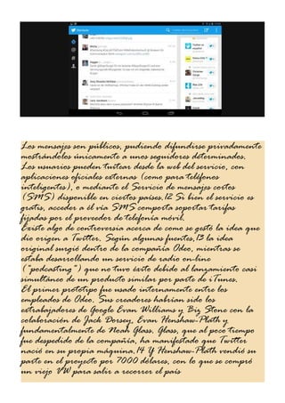 Twitter es un servicio de microblogging fundado en 2006 por Jack Dorsey con sede central en San Francisco. La red social permite a sus más de 500 millones de usuarios enviar mensajes de texto de hasta 140 caracteres llamados tweets. Aunque el servicio es gratuito, los usuarios pueden publicar tweets de forma pública o privada solo para sus seguidores.