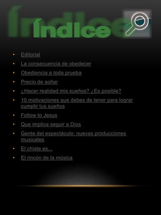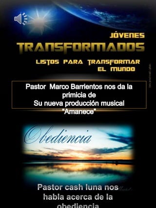 Este documento es una revista llamada "Jóvenes Transformados" creada por Josué Galeas con el propósito de transformar el pensamiento de los jóvenes actuales a través de palabras de aliento y música edificante. Incluye varios artículos sobre temas como la obediencia, los sueños de José en la Biblia, motivaciones para lograr los sueños, y consejos para los jóvenes lectores.