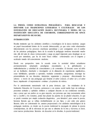 Este documento describe un proyecto para utilizar la poesía como una estrategia pedagógica para rescatar y difundir las tradiciones literarias y culturales de los estudiantes de educación básica y media en la Institución Educativa de Cocorote en Sucre, Colombia. El proyecto se enfocará en sensibilizar a los estudiantes sobre la importancia de preservar su patrimonio cultural a través de la poesía, así como motivarlos a investigar las tradiciones orales de su región para fortalecer su identidad cultural. El