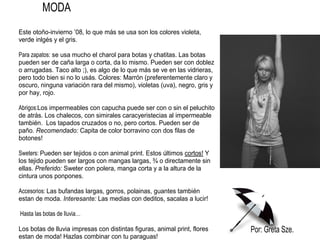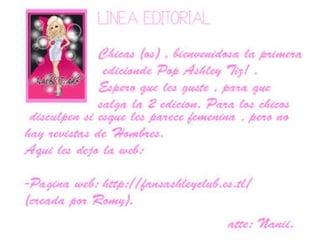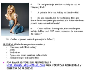 El documento presenta un resumen de una entrevista a la actriz Ashley Tisdale sobre su papel como Sharpay en la película High School Musical. Tisdale menciona que explorar las diferentes facetas de Sharpay fue divertido y que disfrutó tener libertad para elegir sus propios atuendos para el personaje. También habla sobre bailar, cantar y aprender a conducir un carro de golf durante la filmación de la secuela. El documento luego incluye una sección de chismes sobre el nuevo cartel de High School Musical 3 y noticias sobre Brit