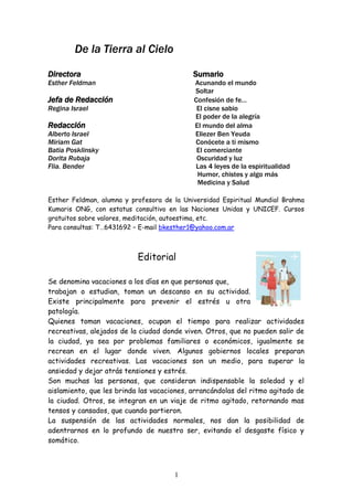 Este documento presenta información sobre un curso espiritual gratuito ofrecido por la Universidad Espiritual Mundial Brahma Kumaris. Incluye artículos sobre temas espirituales como el poder de la alegría, la importancia de soltar el estrés, y historias con moralejas como la del cisne sabio. El documento también presenta biografías breves de científicos eminentes que encontraron evidencia de lo sobrenatural a través de sus estudios científicos.