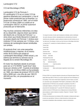 El documento presenta información sobre dos motores de alto rendimiento: el Lamborghini V12 y el Ferrari F430. El motor V12 de Lamborghini se diseñó originalmente en 1963 y ha evolucionado a lo largo de los años, manteniendo su linaje de Fórmula 1. El Ferrari F430 es un automóvil deportivo producido desde 2004 a 2009, que mejoró al modelo 360 Modena con un motor V8 de 4.3 litros y 490 caballos de fuerza capaz de alcanzar 315 km/h.