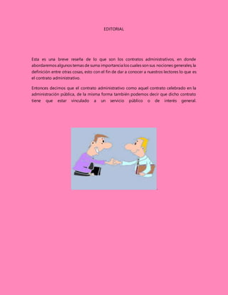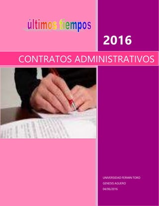El documento describe los contratos administrativos, que son aquellos contratos celebrados por la administración pública y vinculados a un servicio público o de interés general. Explica que la contratación pública se rige por principios de objetividad, transparencia y no discriminación. Además, la jurisprudencia venezolana ha establecido que un contrato es administrativo cuando se celebra para la consecución de un interés general.