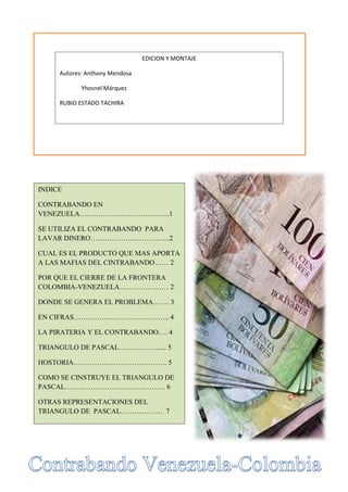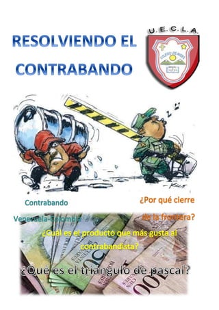El documento habla sobre el contrabando en la frontera entre Venezuela y Colombia. Explica que el contrabando se utiliza para lavar dinero y que los productos más contrabandeados son la gasolina, cigarrillos y electrodomésticos. También menciona que el cierre reciente de la frontera se debió a los problemas generados por el contrabando y la complicidad de las autoridades.