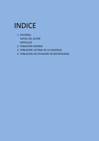 Este documento presenta información sobre cuatro poblaciones diversas: 1) población diversa, resaltando la importancia del respeto por las diferencias y la educación inclusiva; 2) población víctima de la violencia, proponiendo espacios de integración y currículos flexibles; 3) población en situación de discapacidad, garantizando una educación de calidad con apoyo pedagógico adecuado; y 4) la importancia de caracterizar a cada población y aplicar estrategias pedagógicas que permitan el aprend