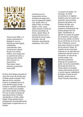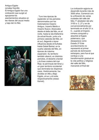 El Antiguo Egipto fue una civilización que surgió alrededor del 3150 a.C. a lo largo del río Nilo, abarcando desde el delta hasta la primera catarata. Tuvo tres periodos de esplendor conocidos como Imperio Antiguo, Imperio Medio e Imperio Nuevo. La civilización egipcia duró más de 3000 años hasta que fue conquistada por Roma en el 31 a.C.