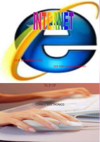El documento proporciona información sobre Internet, incluyendo su historia, tecnologías subyacentes como hipertexto, navegadores web, protocolos TCP/IP, correo electrónico y aspectos como la seguridad, autorregulación y libertad de la red. Explica que Internet es una red descentralizada de redes interconectadas que utiliza protocolos TCP/IP y surgió en 1969 como ARPANET, y que la World Wide Web fue creada en 1989 permitiendo a los usuarios acceder a páginas web a través de navegadores web.