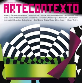 Este documento presenta información sobre la situación del sector cultural y artístico en España durante la crisis económica. Señala que la cultura ha sido uno de los primeros sectores en sufrir recortes a pesar de ser productivo y generar empleo. El sector del arte en particular es débil ya que está formado por microempresas, autónomos y trabajadores precarios con poca estructura industrial. Se necesitan políticas culturales sostenibles a largo plazo en lugar de sólo invertir en infraestructuras faraónicas.