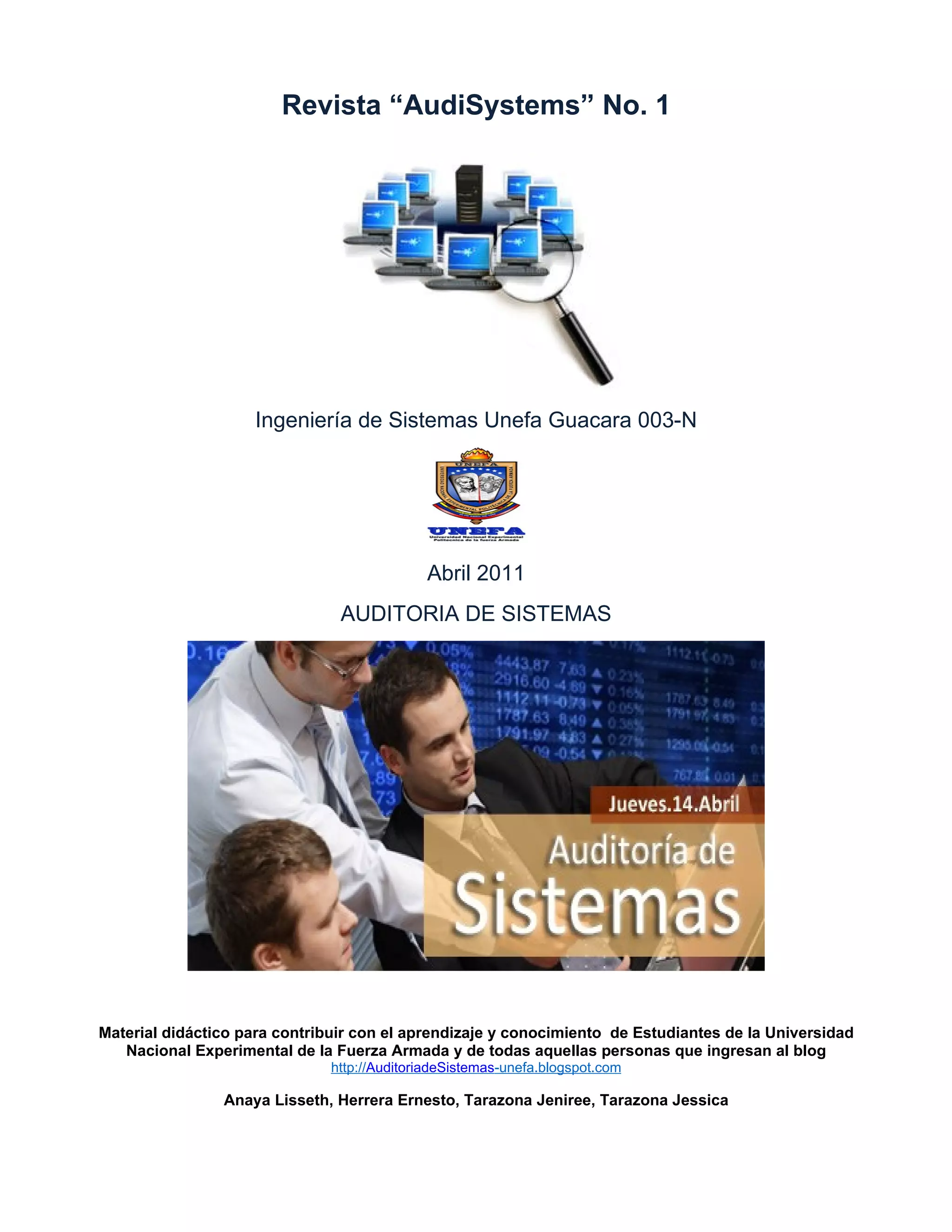 El documento presenta una introducción a la auditoría de sistemas. Explica que la auditoría evalúa y controla sistemas informáticos para proteger activos, verificar el cumplimiento de normas y lograr la eficacia requerida. Distingue entre auditoría interna, realizada dentro de la empresa, y externa, por personas independientes. Además, describe tres tipos de auditoría: de explotación, que verifica resultados; de desarrollo de proyectos, que evalúa fases como análisis y diseño; y de sistemas, que anal