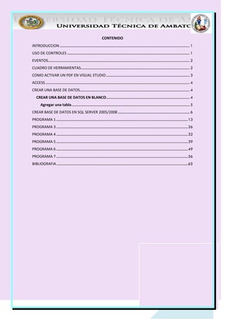 Este documento proporciona instrucciones para diseñar una base de datos en Access que almacene datos básicos de usuario y luego conectarla a una aplicación de Visual Studio para mostrar los datos concatenados del usuario. Explica cómo crear tablas en Access para almacenar datos como nombre, apellido, correo electrónico y luego cómo conectar la base de datos a Visual Studio usando ADO.NET para recuperar los datos y mostrarlos en un formulario.