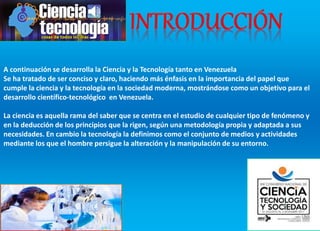 El documento examina la importancia de la ciencia y la tecnología en el desarrollo de la sociedad venezolana, enfatizando su papel como factores clave en el ámbito cultural, social y económico. También se abordan los desafíos actuales, como la inserción laboral de jóvenes científicos y la interrelación entre ciencia y tecnología, que son vistas como una esfera indivisible en la búsqueda de progreso. Finalmente, se destaca la necesidad de una política científica y tecnológica coherente que promueva el desarrollo social y económico en el país.