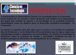 El documento describe brevemente la ciencia, la tecnología y su papel en la sociedad moderna de Venezuela. La ciencia se centra en el estudio de fenómenos y la deducción de principios, mientras que la tecnología se refiere a los medios y actividades para manipular el entorno. La ciencia y la tecnología son pilares del desarrollo cultural, social y económico, y su influencia se extiende a todos los aspectos de la vida actual.