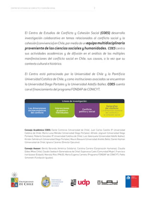 El Centro de Estudios de Conflicto y Cohesión Social (COES) es un centro de investigación multidisciplinario patrocinado por universidades chilenas que estudia el conflicto social y la cohesión en Chile. COES realiza investigaciones sobre las causas y manifestaciones del conflicto social en el país considerando su contexto cultural e histórico, y tiene líneas de investigación sobre conflicto político y social, geografías del conflicto, interacciones grupales e individuales, y dimensiones socioeconómicas del conflicto.