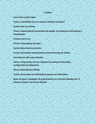 Este documento presenta un proyecto de una revista digital creada por estudiantes de la Escuela Secundaria Técnica Industrial y Comercial No.56 "José Antonio Torres". El proyecto incluye artículos sobre temas de herramientas informáticas como ensamblado de computadoras, mantenimiento de equipos, procesadores de texto y hojas de cálculo, entre otros. Los estudiantes proveen enlaces e imágenes para que los lectores exploren más sobre cada tema.