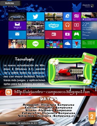 Este documento contiene información sobre varios temas incluyendo juegos de lógica como la Torre de Hanói, el pasatiempo El Ahorcado, datos interesantes sobre varios temas en la sección "¿Sabías que?", información sobre el mes de la patria de Guatemala en septiembre y una guía sobre diferentes actividades escolares.