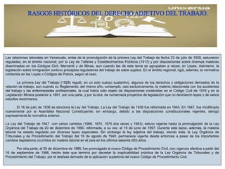 Este documento describe brevemente la historia y evolución de la legislación laboral en Venezuela desde 1917 hasta la actualidad. Explica que la primera Ley del Trabajo se promulgó en 1928 y desde entonces ha habido varias reformas y actualizaciones de la legislación, incluyendo la Ley Orgánica del Trabajo de 1990 y reformas en 1997. También describe la transición del antiguo proceso laboral establecido en 1940 a la nueva Ley Orgánica Procesal del Trabajo de 2002, la cual creó un proceso laboral más simplificado y accesible.