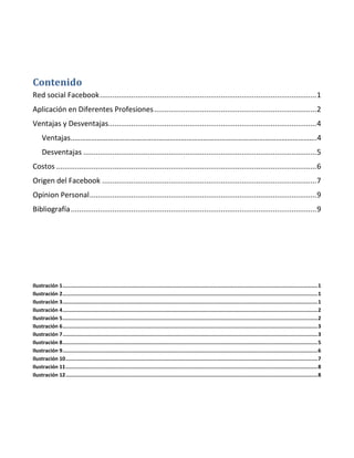 El documento ofrece un análisis exhaustivo sobre el uso de Facebook, destacando su evolución desde una red social exclusiva para estudiantes de Harvard hasta convertirse en una plataforma global con más de 1,350 millones de usuarios. Se abordan las aplicaciones de Facebook en diversas profesiones, sus ventajas y desventajas, y su rol destacado en la comunicación académica. Además, se menciona el origen de Facebook y se proporciona una bibliografía sobre el tema.