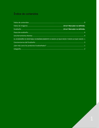 Este documento describe el concepto de ecodiseño y sus beneficios. El ecodiseño es un enfoque de diseño que minimiza el impacto ambiental de los productos a lo largo de todo su ciclo de vida. Al aplicar estrategias de ecodiseño, las empresas pueden reducir costos, mejorar la calidad de los productos, y cumplir con las demandas crecientes de los consumidores por opciones más sostenibles. El documento también resalta la importancia de comunicar las iniciativas de ecodiseño de una empresa para posicionarse favorablemente en