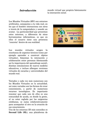Este documento presenta cinco artículos sobre el tema de la educación con soporte virtual. El primer artículo trata sobre la tecnología educativa en Venezuela y cómo ha evolucionado con el desarrollo de las TIC. El segundo artículo discute el nuevo rol del profesor universitario y la importancia de la pedagogía y tecnología. El tercer artículo introduce los mundos virtuales como entornos de aprendizaje. El cuarto artículo analiza las implicaciones de los mundos virtuales en la educación. El quinto artículo explora