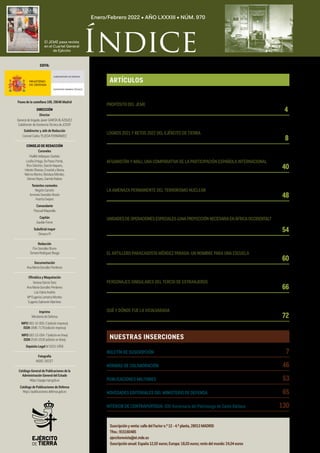 El documento presenta los objetivos del Jefe del Estado Mayor del Ejército de Tierra (JEME) para 2022. El JEME se compromete a impulsar proyectos como el "Ejército 35" para dotar a España de una fuerza moderna y eficaz. También destaca la importancia de la colaboración entre las Fuerzas Armadas y el apoyo a la sociedad española. Su objetivo principal es preparar a la fuerza para cumplir las misiones que determine el Gobierno.