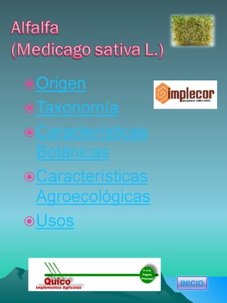 El documento trata sobre la alfalfa y la pangola, dos cultivos forrajeros importantes. Describe el origen y taxonomía de ambas plantas, así como sus características botánicas y agroecológicas. Explica que la alfalfa se originó en Asia Menor y fue introducida en Europa por los persas y árabes, mientras que la pangola proviene de África del Sur y se usa principalmente para pastoreo. Ambas plantas son resistentes y producen forraje nutritivo para el ganado.