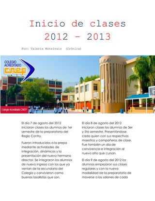 El resumen presenta una breve síntesis de los diferentes artículos y noticias presentadas en el documento. Se describe el inicio de clases en la preparatoria, la entrevista a una maestra, las propuestas de dos planillas estudiantiles, y las opiniones sobre los cambios en la nueva modalidad escolar. En general, el documento cubre diversos eventos y temas relacionados con el inicio del ciclo escolar en la preparatoria del Regio Contry.