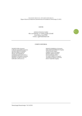 El documento presenta la revista 'Neurocirugía-Neurocirurgia', correspondiente al volumen 16 de 2011, editada por la Federación Latinoamericana de Sociedades de Neurocirugía (FLANC), y aborda temas sobre la neurocirugía en América Latina, incluyendo estructuras administrativas y contribuciones científicas. Se destacan avances en la neurocirugía y la importancia de la educación y apoyo entre países en desarrollo dentro de la región. Además, se incluye un estudio sobre el uso del gel Adcon L en cirugía lumbar que demuestra su eficacia en la reducción de fibrosis peridural postquirúrgica.