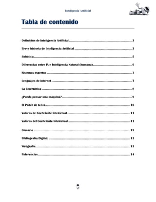 Este documento proporciona una introducción a varios temas relacionados con la inteligencia artificial, incluyendo: 1) una breve historia de la inteligencia artificial, 2) definiciones de inteligencia artificial y sistemas expertos, y 3) preguntas sobre si las máquinas pueden pensar y las diferencias entre la inteligencia artificial e inteligencia humana. También cubre brevemente temas como la robótica, lenguajes de internet, cibernética y valores de coeficiente intelectual.