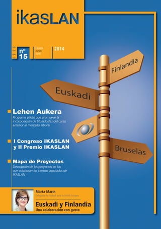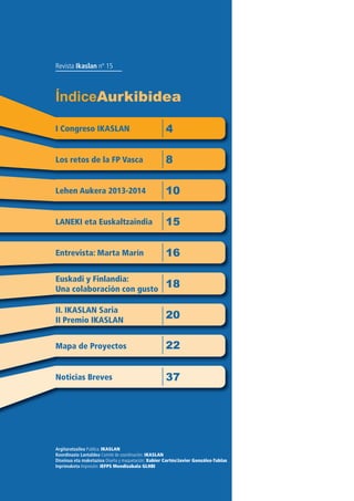 El documento resume el I Congreso de Formación Profesional de IKASLAN celebrado en Vitoria-Gasteiz. Hubo ponencias sobre cómo las nuevas tecnologías y cambios en los modelos productivos están transformando la formación profesional, la importancia del aprendizaje a través del trabajo, y la necesidad de fomentar el espíritu emprendedor. El congreso contó con el apoyo de las administraciones y la participación de alumnos de centros de IKASLAN que se encargaron de tareas como la decoración y el catering
