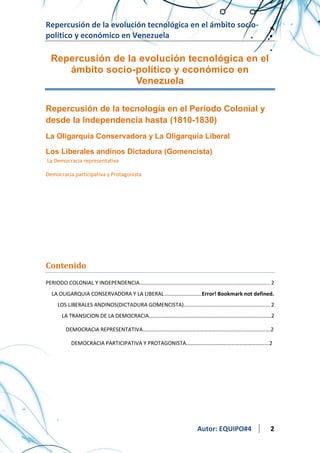 Este documento describe la evolución sociopolítica y económica de Venezuela desde el período colonial hasta la actualidad democracia participativa. Describe los diferentes periodos de gobierno oligárquico conservador y liberal, la dictadura de Gómez, y la transición hacia la democracia representativa y participativa.
