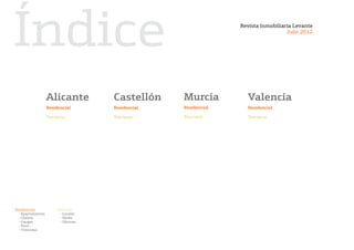 Este documento es la revista inmobiliaria Levante de diciembre de 2012. Contiene anuncios de propiedades residenciales y terciarias en las provincias de Alicante, Castellón y Murcia. Se ofrece información detallada como direcciones, características, precios y descripciones de pisos, apartamentos, chalets, locales, naves y oficinas en diferentes localidades. También se proporciona información de contacto para obtener más detalles sobre las propiedades.