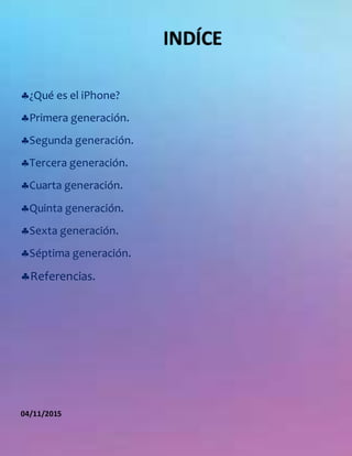 El documento describe las siete generaciones del iPhone de Apple. Detalla las características clave y el año de lanzamiento de cada generación, incluyendo la primera generación en 2007, la adición de 3G en 2008, el soporte de aplicaciones de terceros en 2009, mejoras en la cámara y pantalla en 2010-2012, y el lanzamiento del iPhone 5, 5S y 6 en los años siguientes.