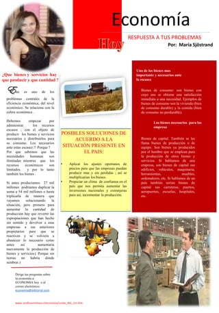 Esta revista trata sobre la escasez de bienes y servicios y posibles soluciones. Explica que debido a los recursos limitados, surge el problema de decidir qué bienes y servicios producir. Para resolverlo, se debe administrar eficientemente los recursos escasos y producir los bienes y servicios necesarios para satisfacer las necesidades humanas. También analiza los tipos de bienes, factores de producción y tecnologías usadas para generar los bienes.