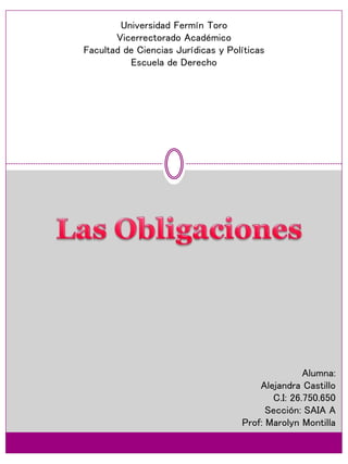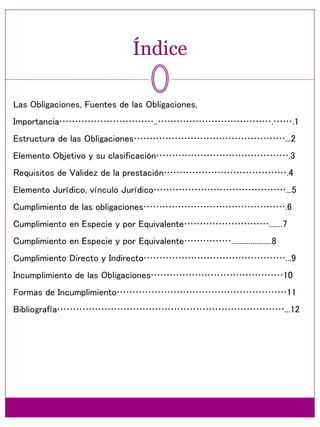 Este documento resume los conceptos fundamentales de las obligaciones en el derecho venezolano. Explica que una obligación tiene dos elementos: el subjetivo, que incluye al acreedor y deudor; y el objetivo, que es la prestación a la que se compromete el deudor. También cubre temas como el cumplimiento de las obligaciones, que puede ser en especie o por equivalente, de forma directa o indirecta, y las formas de incumplimiento como total, parcial, definitivo o temporal, voluntario o involuntario.