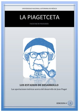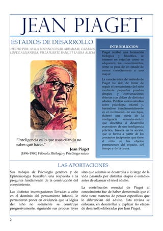 El documento describe los estadios de desarrollo propuestos por Jean Piaget. Explica que Piaget estudió cómo se adquiere el conocimiento y cómo pasa de un estado de menor conocimiento a uno mayor. Propuso cuatro estadios principales de desarrollo: el período sensoriomotor, el subperíodo preoperatorio, las operaciones concretas y las operaciones formales. Cada estadio se caracteriza por diferentes habilidades cognitivas y formas de pensamiento.