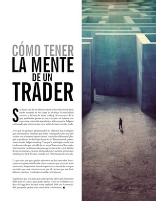 Este documento discute la importancia de la psicología en el trading. Explica que los traders están dominados por sus emociones y son vulnerables a sesgos cognitivos que dañan sus resultados. Para tener éxito en el trading, es crucial comprender los sesgos humanos como el efecto disposición y el sesgo de confirmación, así como conocer la propia función de valor. Sólo manejando las emociones y debilidades psicológicas podrá un trader alcanzar resultados consistentes.
