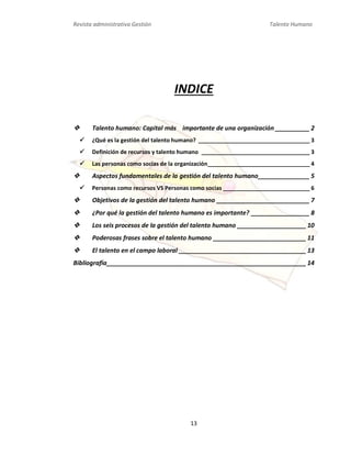 El documento aborda la gestión del talento humano como el capital más importante de una organización, destacando la necesidad de considerar a las personas como socios en lugar de simples recursos. Se enfatiza que la correcta administración del talento humano es crucial para el éxito organizacional, ya que las personas aportan habilidades vitales y motivación. Además, se enumeran los objetivos y procesos de la gestión del talento humano, subrayando la importancia de tratar a los empleados como elementos clave para la eficacia organizacional.