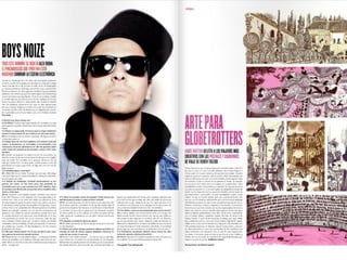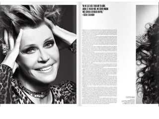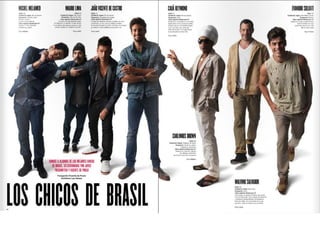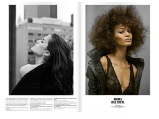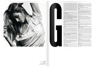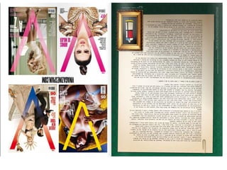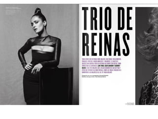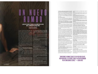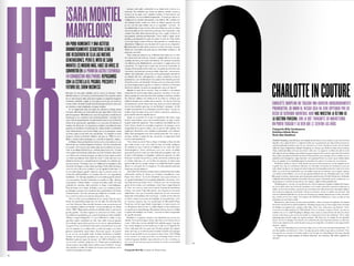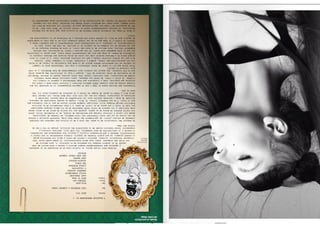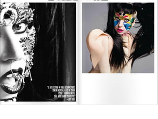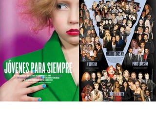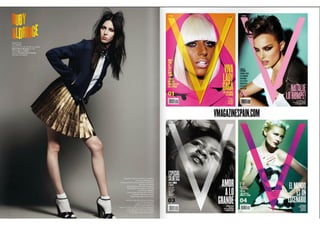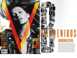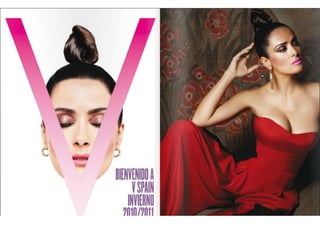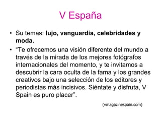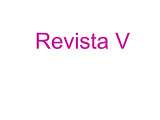 El documento resume las características principales de la revista V España, incluyendo que se enfoca en temas de lujo, moda y celebridades y ofrece una visión diferente del mundo a través de fotografía artística. Describe que la tipografía utilizada es sencilla y la fotografía es el elemento principal, especialmente en la portada donde se destaca la letra V del nombre de la publicación a través de juegos de color.