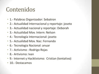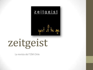 La revista Zeitgeist de TZM Chile aborda temas de actualidad internacional y nacional, reportajes sobre tecnología, activismo y artivismo, así como Internet y hacktivismo. Incluye artículos de diferentes coordinadores que destacan noticias relevantes y avances en el movimiento. Se busca motivar a la acción y generar conciencia sobre cambios sociales necesarios.