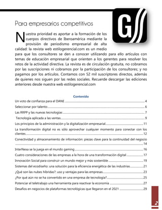 La revista web estilogerencial.com se dedica a la formación de cuerpos directivos en Iberoamérica, ofreciendo artículos gratuitos que abordan temas relevantes para gerentes. El documento discute diversas temáticas como la selección de talento, la transformación digital en empresas, y la importancia de la tecnología en ventas y en la administración moderna. Se enfatiza en la necesidad de adaptarse a nuevas herramientas tecnológicas para mejorar la competitividad y la efectividad empresarial.