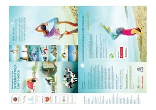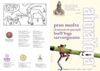 Este documento contiene información sobre diferentes estudios y escuelas de yoga en Barcelona, Girona, Lleida y Valencia. Incluye horarios, direcciones y contactos de los estudios Happy Yoga ubicados en diferentes barrios de Barcelona, así como otros estudios en Palafrugell, Girona y Mallorca. También presenta algunos artículos sobre posturas y técnicas de yoga.