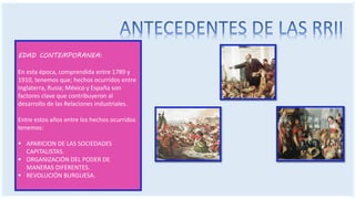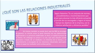 El documento discute el desarrollo histórico de las relaciones industriales a través de los tiempos. Explica que las relaciones industriales surgieron en el siglo 18 como resultado de los cambios sociales y económicos de la revolución industrial, incluyendo la explotación de los trabajadores. Con el tiempo, los trabajadores comenzaron a organizarse en sindicatos para defender sus derechos, dando origen al campo de las relaciones industriales.