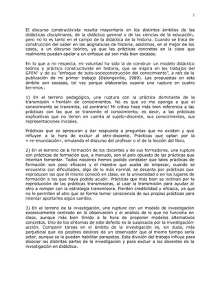 Este documento discute la necesidad de adoptar un enfoque constructivista en la enseñanza de la historia. Argumenta que las representaciones sociales actuales sobre temas históricos son demasiado homogéneas y que se necesitan nuevas situaciones de aprendizaje, como la situación-problema, que ayuden a los estudiantes a cuestionar sus concepciones previas. También señala que adoptar un enfoque constructivista supone romper con prácticas tradicionales de enseñanza, formación de profesores, investigación e interpret