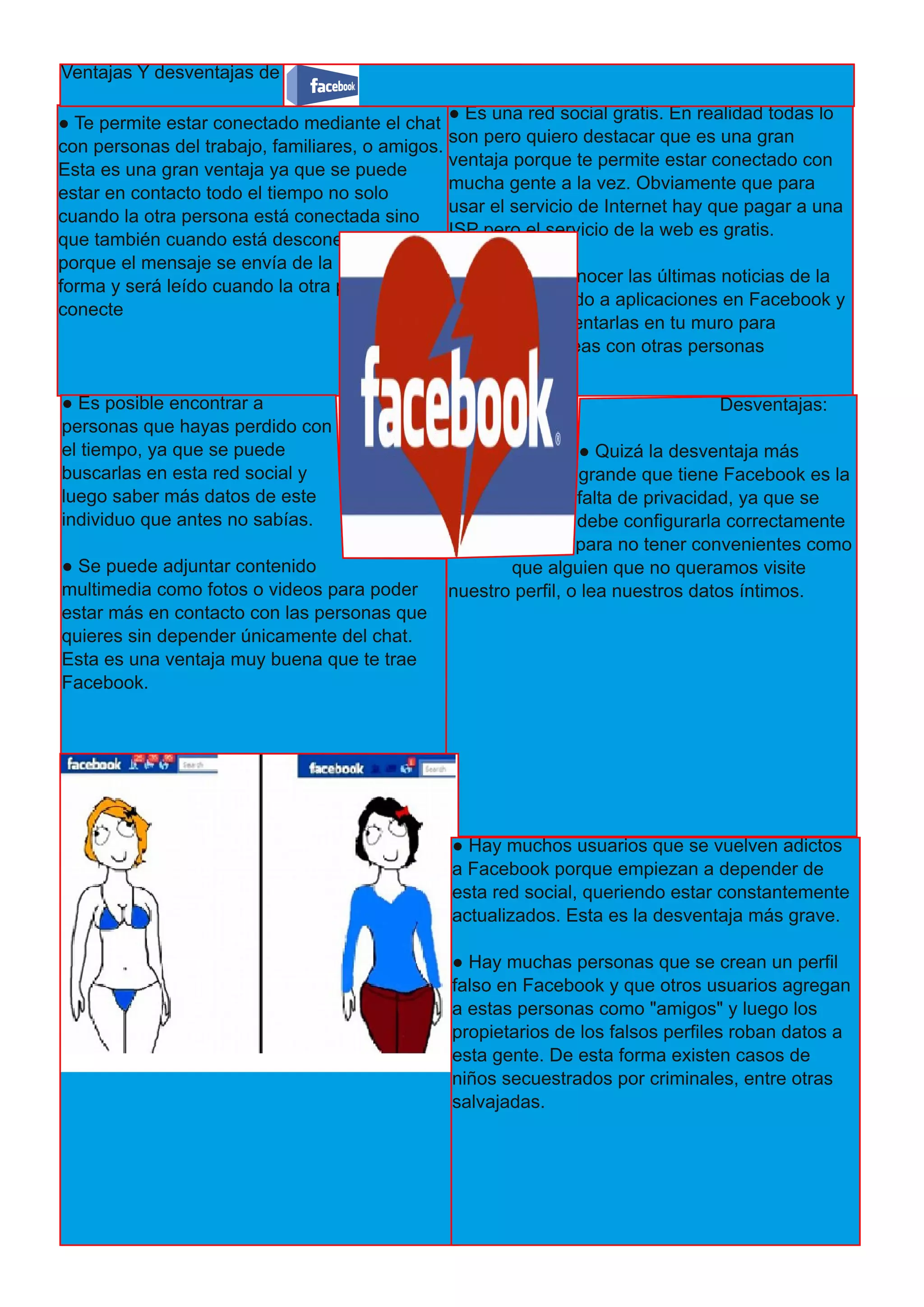 Facebook permite mantenerse en contacto con amigos, familiares y conocidos a través de chat, compartir fotos y videos. También posibilita encontrar personas con quienes se ha perdido el contacto, y mantenerse al tanto de noticias y eventos. Sin embargo, requiere configurar adecuadamente la privacidad y puede generar adicción en algunos usuarios.