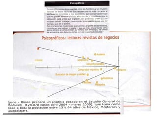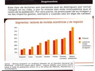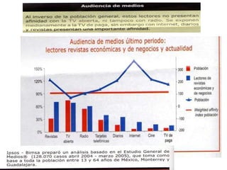 El documento trata sobre la historia y situación actual de la industria de revistas en México. En las primeras oraciones se describe el surgimiento de las revistas en Europa y posteriormente en México. Más adelante, se detallan cifras sobre facturación, crecimiento del mercado, número de títulos, circulación, categorías, costos de publicidad y formatos disponibles. Finalmente, se mencionan tendencias del sector y principales anunciantes.