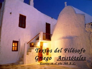 Este documento presenta las enseñanzas filosóficas de Aristóteles sobre la felicidad interior y la paz mental. Aristóteles argumenta que nadie más es responsable de nuestra felicidad y que debemos buscar la divinidad y la respuesta a nuestros problemas dentro de nosotros mismos. También enfatiza la importancia de trabajar para mejorarnos a nosotros mismos, sonreír y estar agradecidos por lo que tenemos.