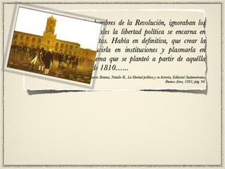La Revolución de Mayo de 1810 en Argentina sentó las bases para la independencia del país. Un grupo de patriotas iluminados lideraron el movimiento revolucionario debido a varias causas como la invasión napoleónica de España y las ideas de la Revolución Francesa. La semana de mayo culminó con la formación de la Primera Junta que reemplazó a las autoridades coloniales españolas y estableció el primer gobierno patrio en Buenos Aires.